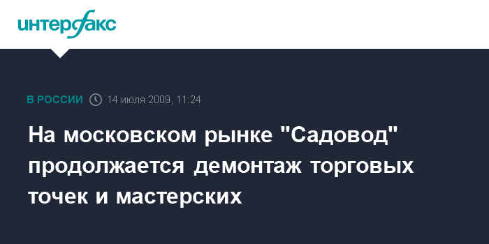 Москва. 14 июля. INTERFAX.RU - На московском рынке "Садовод", несмотря на заверения его руководства, идет демонтаж ряда точек и мастерских, арендаторам которых предписано освободить места до 31 июля.