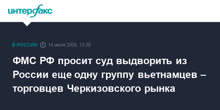 Москва. 14 июля. INTERFAX.RU - Московское управление Федеральной миграционной службы РФ ходатайствует о выдворении на родину еще 24 торговцев Черкизовского рынка - граждан Вьетнама, сообщил "Интерфаксу" во вторник официальный представитель ФМС Константин Полторанин.