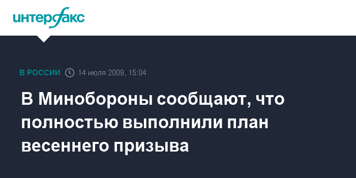 Москва. 14 июля. INTERFAX.RU - План по весеннему призыву в Вооруженные силы РФ, другие войска силовых структур новобранцев выполнен в полном объеме - на военную службу призвано более 305 тыс. юношей, сообщил "Интерфаксу-АВН" во вторник информированный источник в российском военном ведомстве. Нынешний весенний призыв завершается 15 июля.