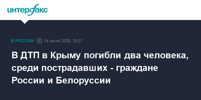 Москва. 14 июля. INTERFAX.RU - В Симферопольском районе Крыма в результате столкновения автомобиля "ВАЗ-2101" и микроавтобуса "Merсedes Sprinter" Крыма один человек погиб на месте происшествия, еще один скончался в больнице. Госпитализированы 17 пострадавших.
