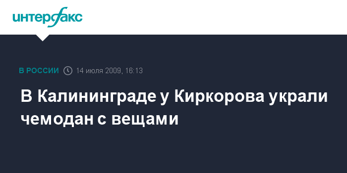 Москва. 14 июля. INTERFAX.RU - В Калининграде у певца Филиппа Киркорова, выступавшего на празднике День рыбака, украли чемодан с вещами. Как сообщила во вторник государственная телерадиокомпания "Янтарь", известный певец выступал на концерте, посвященном Дню рыбака, на стадионе "Балтика". Зрители принимали его восторженно, и Киркоров исполнил значительно больше песен, чем планировалось. Как раз в этот момент из гримерной комнаты, по всей видимости, и был похищен его чемодан.