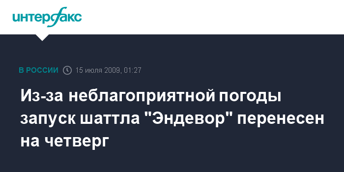 В связи с неблагоприятным прогнозом погоды на предстоящую ночь старт шаттла "Эндевор" с космодрома на мысе Канаверал (шт.Флорида, США) переносится среду (четверг по московскому времени - ИФ-АВН), говорится в сообщении, опубликованном на сайте НАСА.
