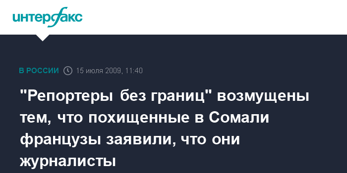 Москва. 15 июля. INTERFAX.RU - Сотрудники организации "Репортеры без границ" возмущены тем, что два советника правительства Франции по безопасности, захваченные накануне группой вооруженных людей в столице Сомали Могадишо, назвались журналистами.