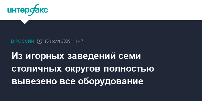 Москва. 15 июля. INTERFAX.RU - Работы по вывозу оборудования из помещений игорных заведений завершены в семи столичных округах, сообщил "Интерфаксу" первый заместитель руководителя пресс-службы мэра и правительства Москвы Леонид Крутаков в среду.