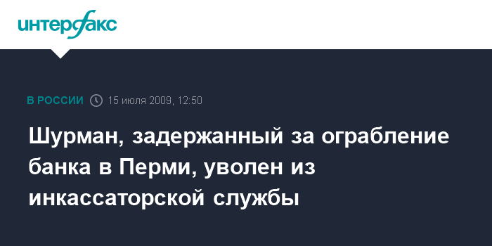 Москва. 15 июля. INTERFAX.RU - Уволены пять сотрудников инкассаторской службы банка в Перми, где задержан инкассатор Александр Шурман, похитивший 250 млн рублей.