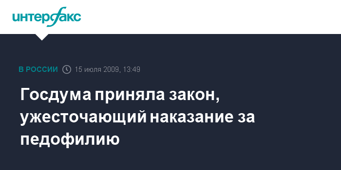 Москва. 15 июля. INTERFAX.RU - Госдума приняла в третьем, окончательном чтении внесенный президентом Дмитрием Медведевым законопроект, направленный на ужесточение наказания за педофилию.