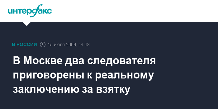 Москва. 15 июля. INTERFAX.RU - Мосгорсуд приговорил к семи и восьми годам заключения двух следователей линейного ОВД станции "Москва-Белорусская", признав их виновными в получении взятки в $250 тысяч.