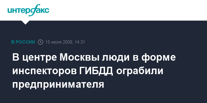 Москва. 15 июля. INTERFAX.RU - В Москве на проспекте Мира преступники, переодетые в форму сотрудников ГИБДД, похитили у предпринимателя около 3 млн рублей, сообщил "Интерфаксу" источник в правоохранительных органах в среду.