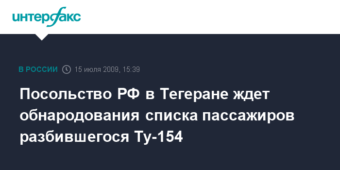 Тегеран. 15 июля. INTERFAX.RU - Посольство России в Иране ожидает, когда иранская авиакомпания Caspian Airlines, чей самолет Ту-154 разбился в среду на северо-западе Ирана, обнародует списки пассажиров данного рейса с указанием их гражданства.