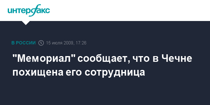 Москва. 15 июля. INTERFAX.RU - Правозащитная организация "Мемориал" сообщает о похищении в Грозном своего сотрудника. Как рассказал "Интерфаксу" в среду сотрудник "Мемориала" Александр Черкасов, сегодня в 08:30, когда Наталья Эстимирова вышла из своего дома в Грозном, ее схватили, посадили в белую автомашину ВАЗ-2107 и увезли в неизвестном направлении.