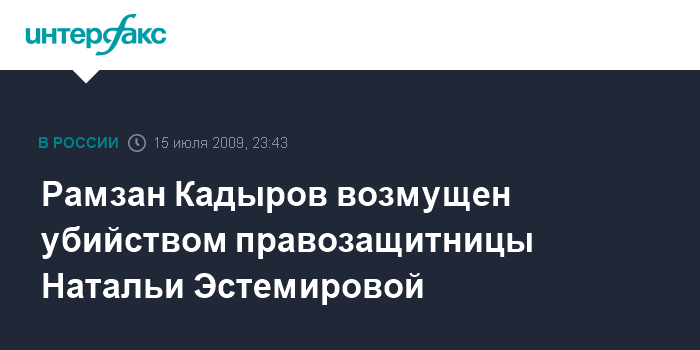 Грозный. 15 июля. ИНТЕРФАКС-ЮГ - Похищение и убийство правозащитницы Натальи Эстемировой носит циничный характер, оно совершено с целью очернить народы Чечни и Ингушетии в глазах российского и мирового сообществ, заявил президент Чеченской республики Рамзан Кадыров.