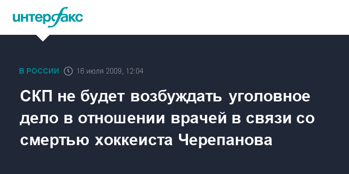 Москва. 16 июля. INTERFAX.RU - Органами следственного комитета при прокуратуре РФ по Омской области принято решение отказать в возбуждении уголовного дела в отношении врачей в связи с фактом смерти в октябре 2008 года хоккеиста Алексея Черепанова, сообщил официальный представитель СКП РФ Владимир Маркин.