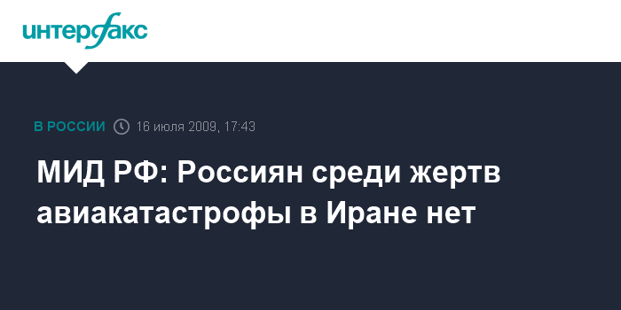 Москва. 16 июля. INTERFAX.RU - МИД РФ подтвердил отсутствие сведений о том, что на борту разбившегося в Иране в минувшую среду самолета были россияне.