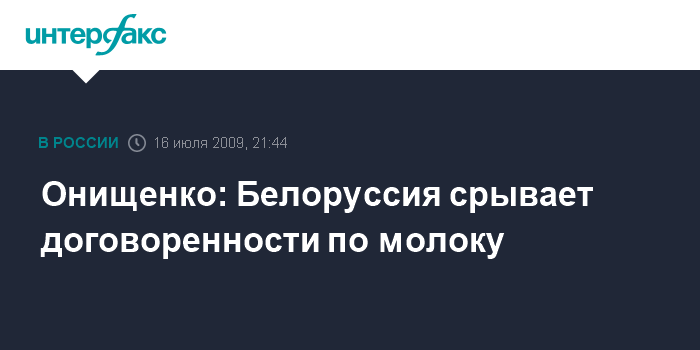 "Руководство соседнего государства ведет работу на срыв договоренностей, достигнутых 17 июня, по доступу на российский рынок белорусской молочной продукции параллельно с оформлением документов в соответствии с российским законодательством (техрегламентом на молоко и молочную продукцию)", - сказал Онищенко "Интерфаксу" в четверг.