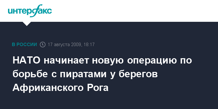Лиссабон. 17 августа. INTERFAX.RU - Командование НАТО утвердило проведение и начало новой военно-морской операции по борьбе с пиратами у берегов Африканского Рога, получившую название "Океанский щит", сообщает в понедельник агентство ЭФЭ со ссылкой на штаб объединенных вооруженных сил НАТО в Лиссабоне.