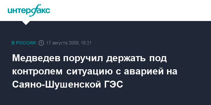 Медведев поручил держать под контролем ситуацию с аварией на Саяно-Шушенской ГЭС