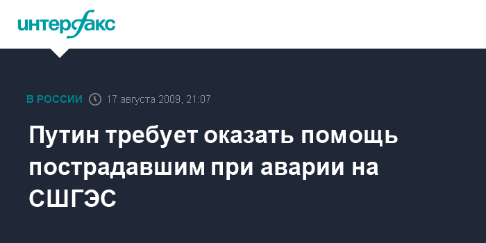 Москва. 17 августа. INTERFAX.RU - Премьер РФ Владимир Путин обратился к сотрудникам МЧС, работающим в Хакасии на ликвидации последствий аварии на Саяно-Шушенской ГЭС, с просьбой срочно оказать помощь пострадавшим при аварии и их семьям.
