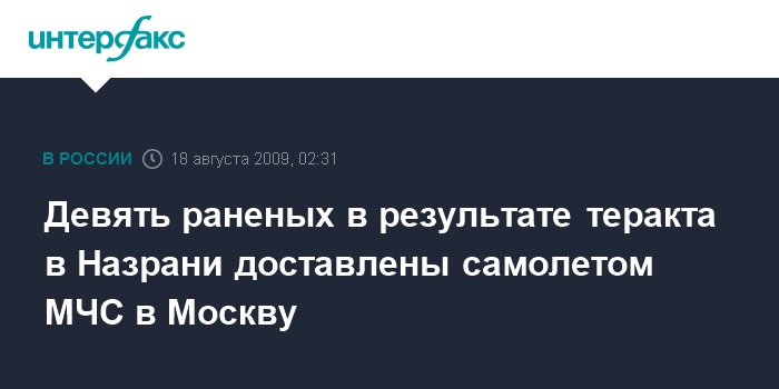 Москва. 18 августа. ИНТЕРФАКС - Девять раненых в результате теракта в Назрани доставлены самолетом МЧС в Москву, сообщили "Интерфаксу" в Управлении информации МЧС России.