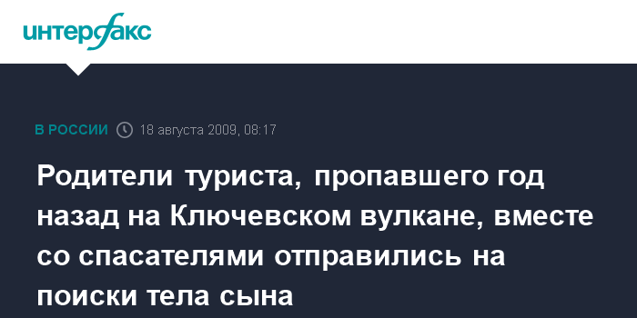 Москва. 18 августа. INTERFAX.RU - Родители туриста, пропавшего прошлой осенью на Ключевском вулкане, прилетели на Камчатку из Челябинска, чтобы вместе со спасателями продолжить поиск тела сына.