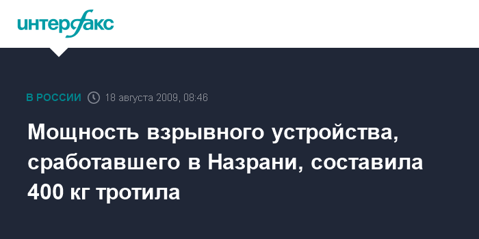 Москва. 18 августа. INTERFAX.RU - Мощность взрыва во время теракта в Назрани составила 400 кг в тротиловом эквиваленте, сообщил "Интерфаксу" во вторник источник в правоохранительных органах.