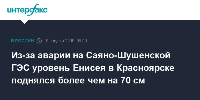 Москва. 18 августа. INTERFAX.RU - Уровень воды в Енисее в районе Красноярска за сутки, прошедшие после аварии на Саяно-Шушенской ГЭС, поднялся на 73 см.
