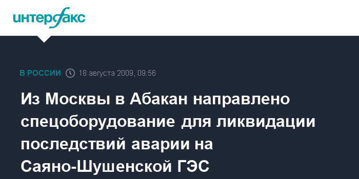Из Москвы в Абакан направлено спецоборудование для ликвидации последствий аварии на Саяно-Шушенской ГЭС