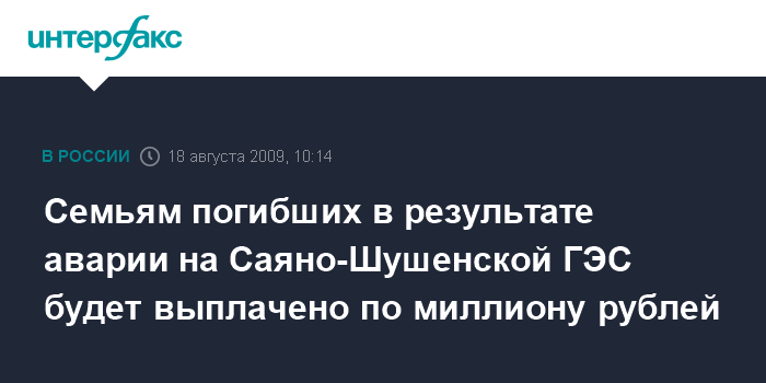 Москва. 18 августа. INTERFAX.RU - Компания "РусГидро" приняла решение выплатить семьям погибших в результате аварии на Саяно-Шушенской ГЭС по 1 млн руб.