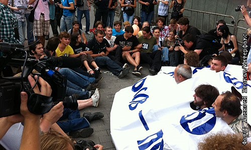 В воскресенье оппозиция провела акцию в защиту 31-й статьи Конституции РФ в необычной форме - митинг на этот раз был "сидячим"% около 40 участников акции расположились на асфальте с плакатами рядом с Концертным залом имени Чайковского и на углу площади около ресторана "Пилзнер"