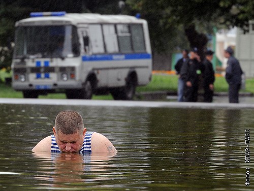 Десантник высадился в фонтанный пруд Центрального парка культуры и отдыха имени М. Горького во время празднования Дня Воздушно-десантных войск РФ