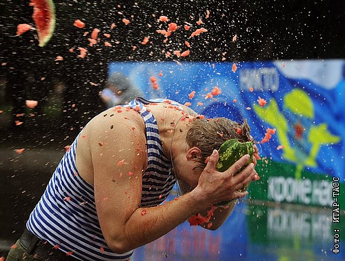 Десантник и арбуз во время празднования Дня Воздушно-десантных войск РФ на территории Центрального парка культуры и отдыха имени М. Горького