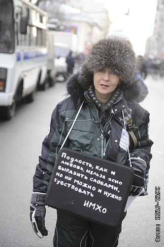 Очень мало плакатов, относящихся к тематике митинга - требования отмены "закона Димы Яковлева". Но тем не менее, много транспарантов с фотографиями депутатов Госдумы и надписями "Позор!". В толпе втречаются также люди, собирающие деньги в поддержку "узников 6 мая".