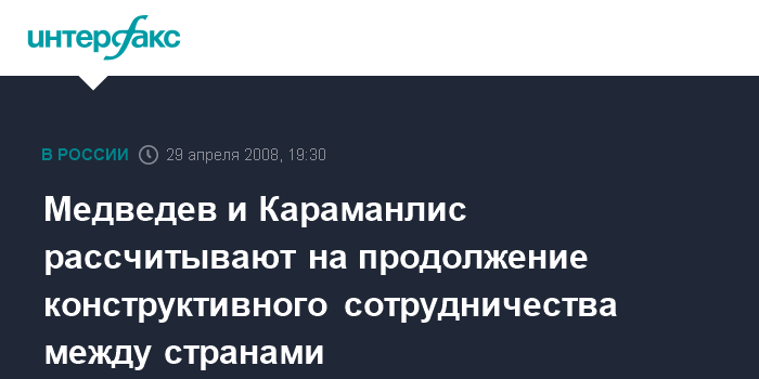 Москва. 29 апреля. ИНТЕРФАКС - Избранный президент России Дмитрий Медведев и премьер-министр Греции Константинос Караманлис выражают надежду на продолжение стратегического партнерства двух стран.