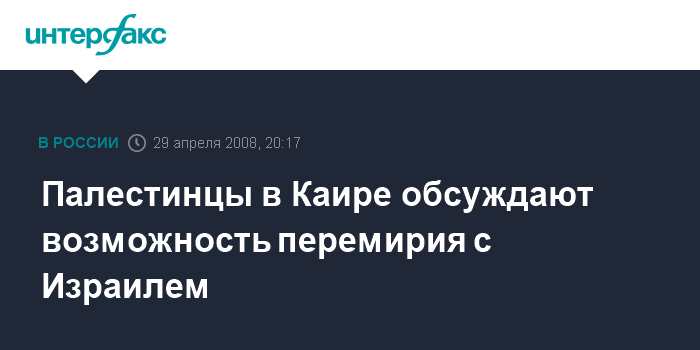 Каир. 29 апреля. ИНТЕРФАКС - Группировки, представляющие ряд палестинских движений, во вторник в Каире начали переговоры, в ходе которых планируется выработать позицию по вопросу о перемирии с Израилем. На прошлой неделе контролирующее сектор Газа движение ХАМАС дало принципиальное согласие заключить такое перемирие.