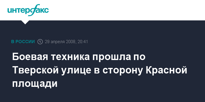 Москва. 29 апреля. ИНТЕРФАКС - Боевая техника, которая во вторник примет участие в общей репетиции Дня Победы на Красной площади с участием войск, проследовала по Тверской улице в сторону Красной площади, передает корреспондент "Интерфакса".