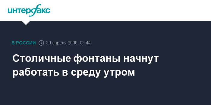 Москва. 30 апреля. ИНТЕРФАКС-МОСКВА - В среду будут запущены все столичные фонтаны, сообщил "Интерфаксу" руководитель комплекса жилищно-коммунального хозяйства Петр Бирюков.