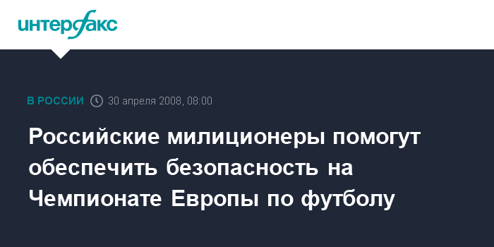 Москва. 30 апреля. INTERFAX.RU - Российские милиционеры будут помогать обеспечивать охрану общественного порядка на чемпионате Европы по футболу, сообщил в среду журналистам первый заместитель министра внутренних дел Российской Федерации генерал-лейтенант милиции Михаил Суходольский.