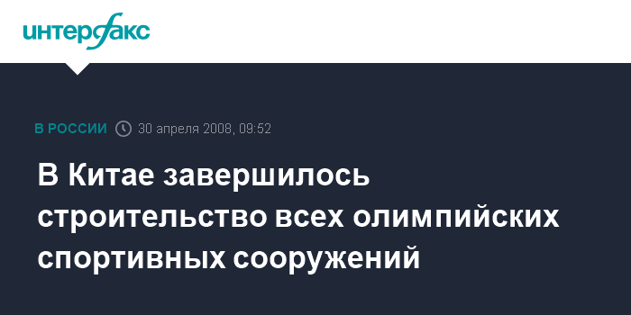 Пекин. 30 апреля. INTERFAX.RU - Пекин в строго соответствии с графиком завершил строительство и оборудование всех спортивных объектов и сооружений, на которых будут проходить соревнования и тренировки спортсменов-олимпийцев, сообщили в среду официальные китайские СМИ.