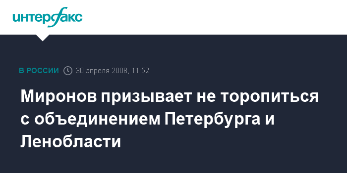 Санкт-Петербург. 30 апреля. INTERFAX.RU - Спикер Совета Федерации Сергей Миронов призывает внимательно изучить вопрос возможного объединения Петербурга и Ленинградской области. Выступая в среду перед петербургскими депутатами, С.Миронов сказал, что "торопиться не надо, а надо внимательно изучить вопрос и мнение жителей двух регионов".