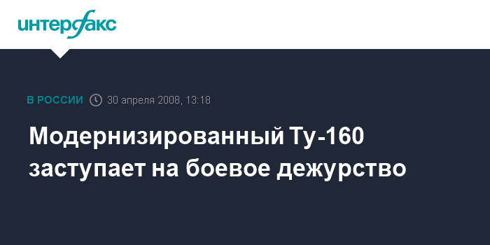 Москва. 30 апреля.INTERFAX.RU - Поступивший на вооружение ВВС России новый модернизированный стратегический ракетоносец Ту-160 в среду заступает на боевое дежурство. Об этом сообщил командир 121-й тяжелой бомбардировочной авиадивизии Александр Блаженко.