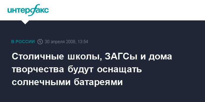 Москва. 30 апреля. INTERFAX.RU - Столичное ООО "Экоэнерго" планирует к осени 2008 г. оборудовать солнечными батареями несколько школ, дом творчества и ЗАГСов Москвы. Об этом сообщил генеральный директор компании Сергей Ткачев. Он отметил, что в будущем году такими батареями оснастят также несколько московских больниц.