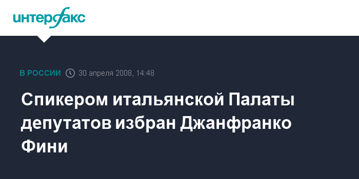 Рим. 30 апреля. INTERFAX.RU - Лидер партии "Национальное движение" Джанфранко Фини избран председателем нижней палаты парламента Италии - Палаты депутатов, передают в среду итальянские СМИ. Во время четвертого тура голосования за 56-летнего Фини - союзника будущего председателя правительства Италии Сильвио Берлускони - проголосовали 335 из 611 присутствовавших на заседании депутатов.