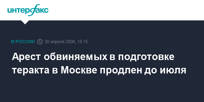 Москва. 30 апреля. INTERFAX.RU - Мосгорсуд продлил до 8 июля срок ареста трем фигурантам дела о подготовке теракта в Москве на майские праздники в 2007 году.