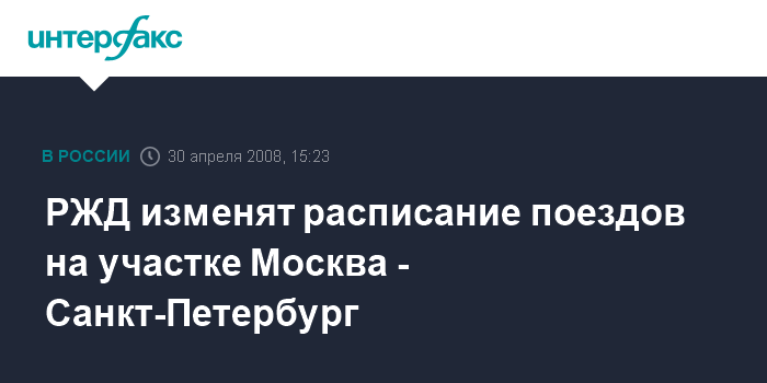 Москва. 30 апреля. INTERFAX.RU - ОАО "Российские железные дороги" с 22:00 мск 6 мая на сутки частично изменит расписание движения поездов на участке Москва - Санкт-Петербург в связи с работами по организации скоростного движения.