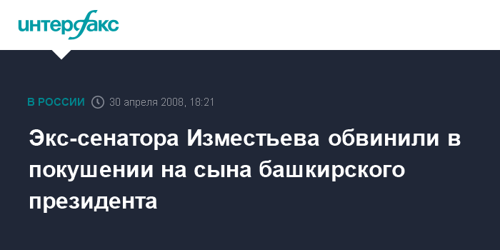Москва. 30 апреля. INTERFAX.RU - Экс-сенатору от Башкирии Игорю Изместьеву предъявлено новое обвинение - теперь его обвиняют в покушении на убийство сына президента этой республики Урала Рахимова.