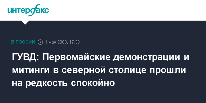 Санкт-Петербург. 1 мая. ИНТЕРФАКС-СЕВЕРО-ЗАПАД - В ГУВД Петербурга и Ленинградской области отмечают спокойный характер прошедших в городе первомайских мероприятий.