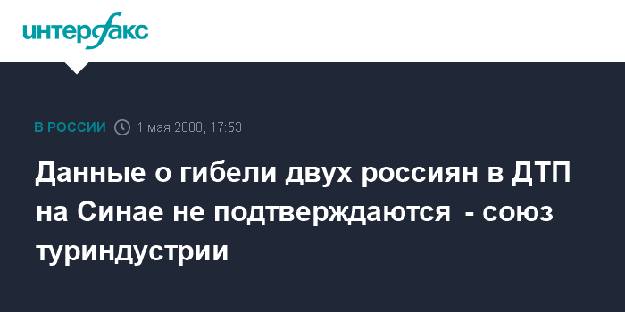 Москва. 1 мая. ИНТЕРФАКС - Представитель Российского союза туриндустрии (РСТ) Ирина Тюрина опровергла появившиеся ранее данные о гибели двух граждан РФ в результате ДТП с участием автобуса в Египте.