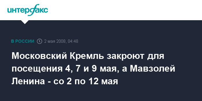 Москва. 2 мая. ИНТЕРФАКС - В связи с подготовкой и проведением государственных праздничных мероприятий Московский Кремль и Мавзолей В.И.Ленина будут несколько дней в мае закрыты для посещения.