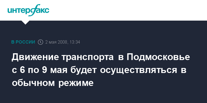 Москва. 2 мая. ИНТЕРФАКС - ГИБДД Подмосковья не планирует закрывать или ограничивать движение транспорта в период проведения мероприятий, связанных с празднованием Дня победы и инаугурацией президента.