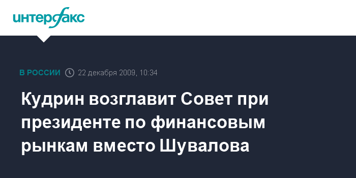 Москва. 22 декабря. INTERFAX.RU – Вице-премьер, министр финансов Алексей Кудрин возглавит Совет при президенте РФ по развитию финансовых рынков вместо первого вице-премьера Игоря Шувалова, сообщили агентству "Интерфакс-АФИ" два источника, близких к совету.