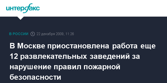 Москва. 22 декабря. INTERFAX.RU – В столице судебными решениями приостановлена деятельность еще 12 ресторанов, клубов и других учреждений досуга из-за нарушений правил пожарной безопасности, сообщили "Интерфаксу" в пресс-службе ГУ МЧС по Москве во вторник.